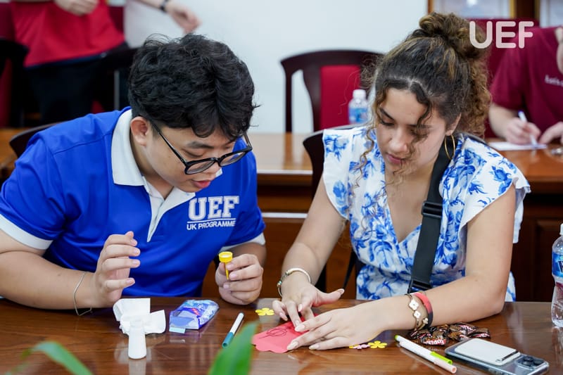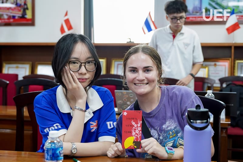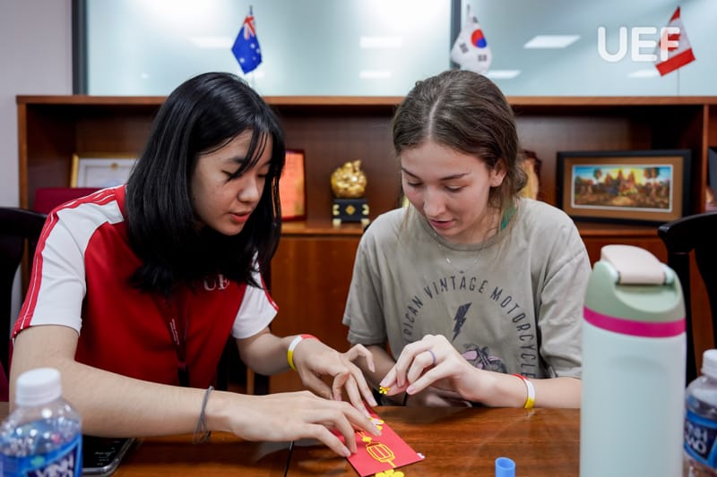 Later that day, students joined the “Cultures Exchange and Games” activity with participants from UEF’s British Bachelor’s Program (UoG). Guided by the IEF Club, they discovered Vietnam’s history and unique traditions, including clothing, food, festivals, and landmarks. A standout moment was the hands-on activity of creating lì xì (lucky money envelopes), a cherished tradition during the Lunar New Year.