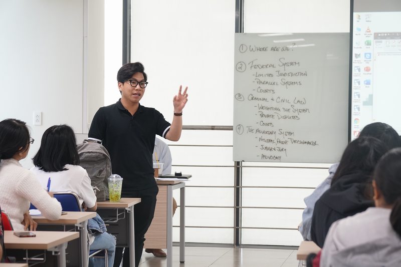 After that, UEF students had their first class with Prof. Robert E.Shapiro on “Structure of American Law”. During the class, Pro. Robert E.Shapiro discussed with students about the two basic law structures: Civil Law and Common Law. They are the foundation of laws worldwide and therefore must be well learned by every lawyer. Prof. Robert E.Shapiro also spent some time on the US Constitution and Adversary System.