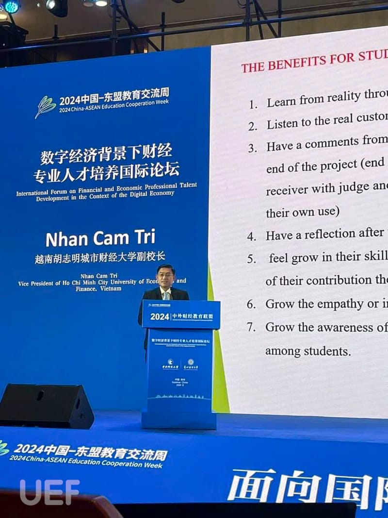 UEF representatives notably participated in a forum on higher education in the field of economics and finance in the era of artificial intelligence, organized by Beijing University of Economics and Finance. The event brought together nearly 100 delegates from 60 universities specializing in economics and finance across China and ASEAN countries. During the forum, Dr. Nhan Cam Tri delivered a speech titled: 'Service Learning - A Teaching Model That Helps Learners Gain Awareness of Sustainable Development in the Context of AI.