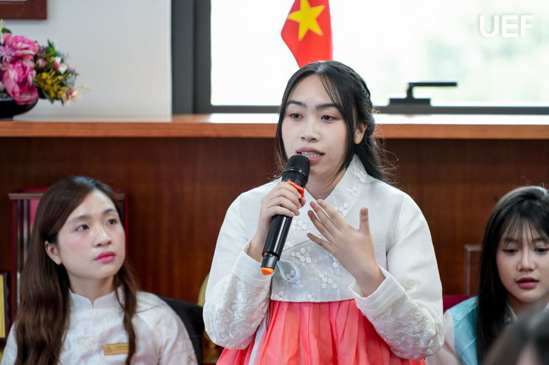 Also within the framework of the collaboration, a lively exchange took place between Consul General Shin Choong Il and UEFers. He candidly shared about practical recruitment requirements in Korean enterprises, essential skills for working in cross-cultural environments, the growing trend of interdisciplinary integration between language and other fields, as well as key industries that Korea is focusing on in the near future. This aligns with UEF’s practical training orientation, as the Korean Language major is divided into four specialized tracks: Business and Commerce, Translation and Interpretation, Korean Culture and Tourism, and Korean Language Teaching.