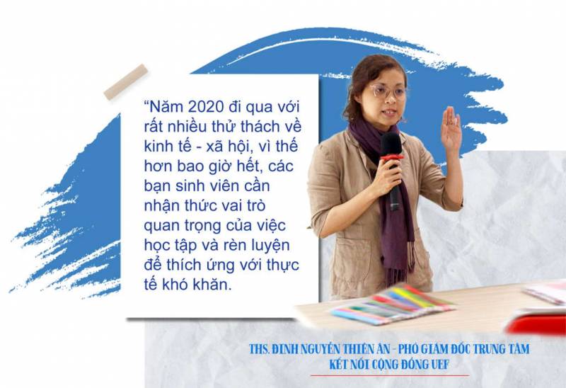 Supporting and participating in UEF Service - Learning from the very first day, Ms. Dinh Nguyen Thien An – Vice Director of UEF Community Connection Centre shared “The year 2020 has seen a number of challenges in socio-economy; therefore, students should have the awareness of the important role of learning and practicing to adapt to difficulties. At the same time, they should be active and ready for the future plans for which the preparations can be found in experiencing Service-Learning. In the part year, UEF has maintained the continual of the projects and marked the success of the implementation of some community activities into some subjects as well as the increase of such fresh and creative projects to provide the students with essential skills.”