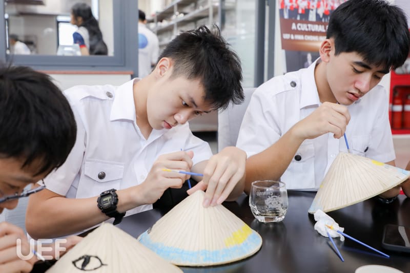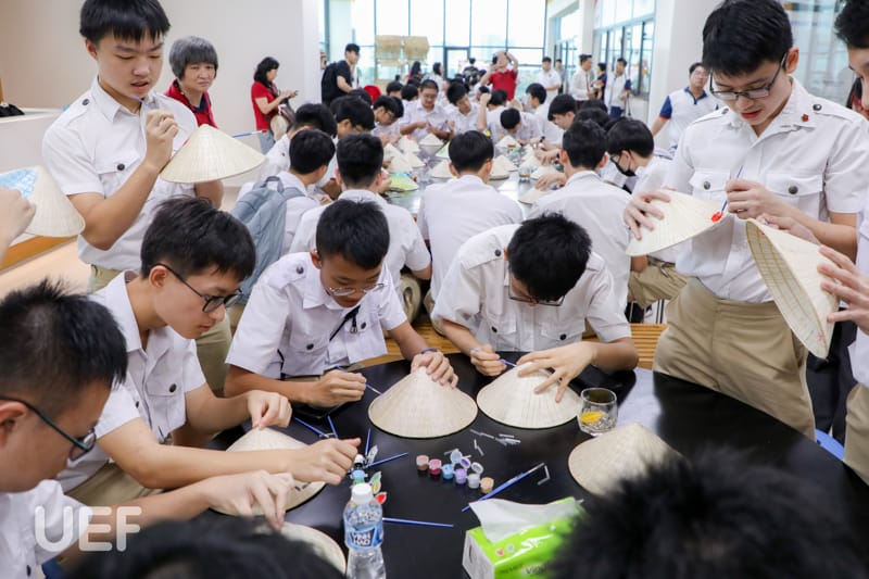 The representatives of HCI introduced the establishment process and general information about their institution. The exchange became more lively with many performances and the conical hat decoration activity. At the end of the program, HCI students visited and shared their impressions of the modern facilities at UEF.