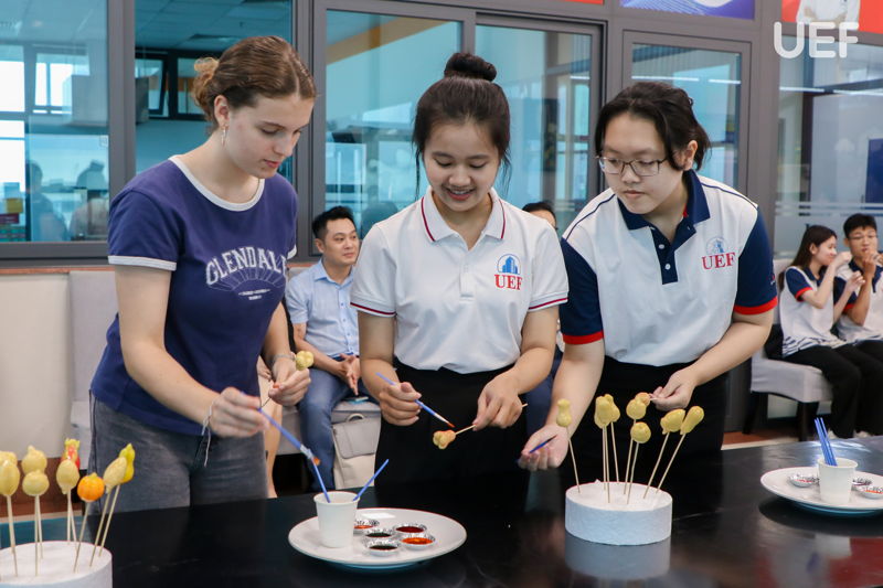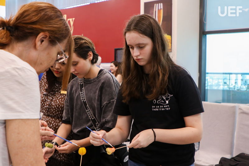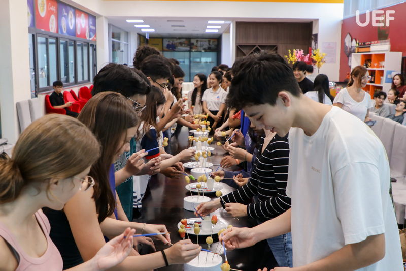 Additionally, the event featured a hands-on activity where participants made and enjoyed fruit-shaped mung bean cakes — a colorful and popular sweet among young people in Vietnam. This was followed by interactive minigames, light entertainment activities, and a sweet party with pastries, cocktails, and more. Altogether, these activities created a relaxed and friendly atmosphere where students from both sides could engage in conversations, make new friends, and create lasting memories during their visit to UEF.