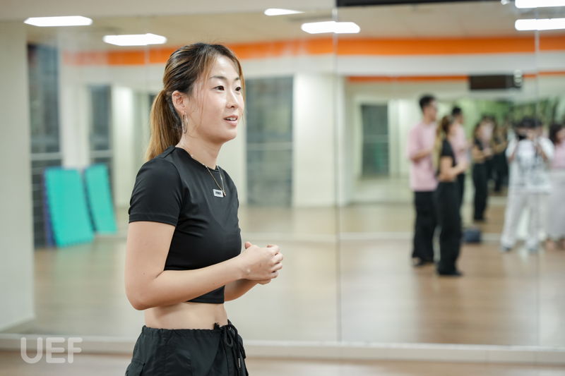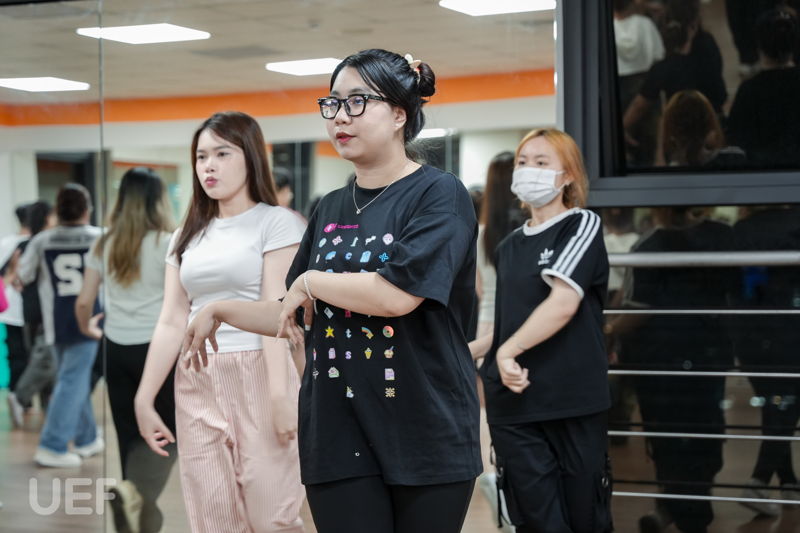 In order to prepare for the best possible performance, Ms. Jung Sol began with the first lesson immediately after her guidance. Students were grouped and started practicing under her attentive instruction. The class atmosphere was both enthusiastic and disciplined, with UEF students showing eagerness and determination to master each move smoothly and precisely. Those with a natural talent for dance, who quickly picked up and remembered the steps, also assisted their peers during practice.