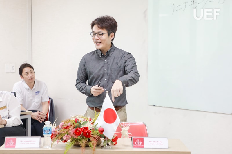 Attending the program were Dr. Vo Van Thanh Than - Director of Center of Vietnam-Japan Human Resources Development, Deputy Dean of the Faculty of Languages and International Cultures; Mr. Cao Do Quyen - Program Assistant, Japanese Language; Mr. Akao Naoki - Principal of the International Center - ASO College Group and Mr.Minami Hiroya - Director of Terakoya Company.