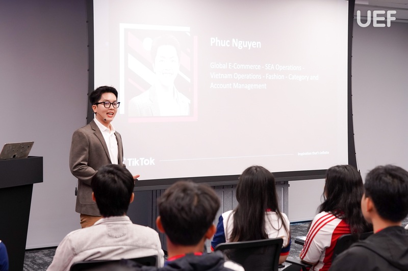 Đón tiếp đoàn có anh Phúc Nguyễn - đại diện Global E-Commerce, SEA Operations Vietnam, mảng Fashion - Category and Account Management tại TikTok Shop Việt Nam. Với kinh nghiệm đồng hành với nền tảng TikTok Shop từ khi bắt đầu triển khai tại thị trường Việt Nam, diễn giả Phúc Nguyễn đã mang đến cho các bạn sinh viên góc nhìn toàn diện về xu hướng ngành cũng như tìm kiếm định hướng cho bản thân mình.