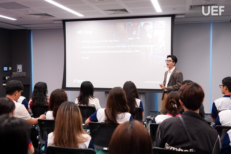 Tại buổi gặp gỡ, anh Phúc Nguyễn giới thiệu chương trình trải nghiệm thực tập dài hạn kéo dài 24 tháng về quy trình tuyển dụng, quy trình đào tạo, định hướng sự nghiệp,... Đây là cơ hội đặc biệt dành cho sinh viên năm hai, năm ba đang quan tâm và có thế mạnh ở lĩnh vực thương mại điện tử. Thông qua chương trình này, sinh viên có thể trực tiếp tham gia vào quy trình vận hành tại TikTok với các công việc liên quan đến tìm kiếm và hỗ trợ nhà bán hàng, phát triển đối tác chiến lược, phân tích tình hình kinh doanh và đề xuất sáng kiến mới, quản lý nhà sáng tạo nội dung trên nền tảng.