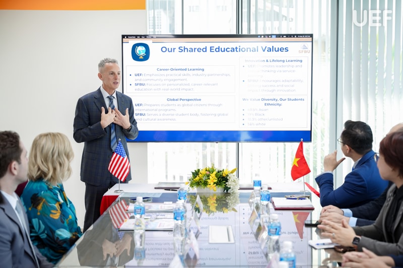 Buổi ký kết mở đầu bằng phần giới thiệu tổng quan về hai trường. Đại diện UEF và SFBU đã cùng chia sẻ về định hướng đào tạo, chương trình học cũng như thế mạnh nổi bật trong việc phát triển học thuật và đào tạo nguồn nhân lực chất lượng cao, đặc biệt trong nhóm ngành Công nghệ thông tin - lĩnh vực mà cả hai trường đều đang có sự tập trung đầu tư mạnh mẽ.