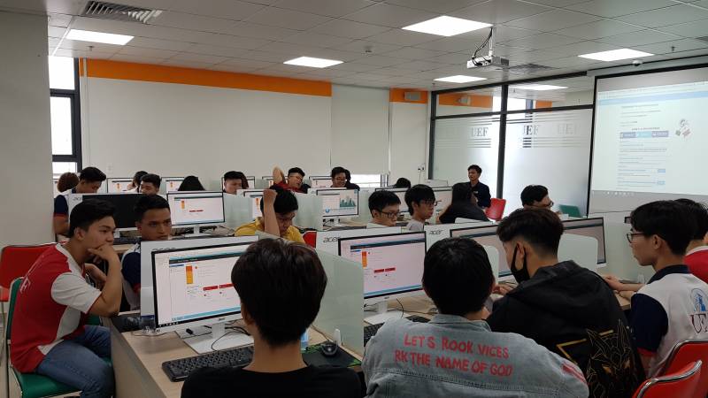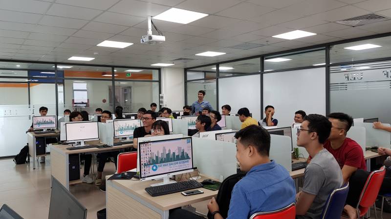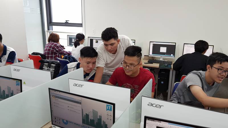 Sinh viên háo hức thực hành dưới sự hướng dẫn của Thầy Thắng và Thầy Hiếu