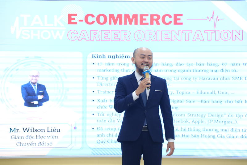Buổi talkshow trở nên thu hút hơn khi các diễn giả chia sẻ nhiều thông tin thực tế, liên quan đến ngành Thương mại điện tử, định hướng nghề nghiệp, cũng như cơ hội việc làm của các cử nhân công nghệ. Trong đó, ông Wilson Liêu - Giám đốc Học viện chuyển đổi số (Next Academy) đã nói đến những kiến thức bổ ích về thị trường thương mại điện tử tại Việt Nam. Cụ thể, các bạn cần chuẩn bị những gì trong lĩnh vực này, quy trình thương mại điện tử, nhóm việc làm đa dạng của ngành và nguồn nhân lực cần thiết.