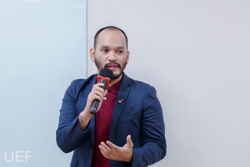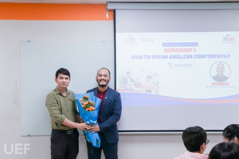 Ngay sau chương trình FIT Company Tour, cuộc thi Olympic Tin học sinh viên, sáng ngày 10/12, Khoa tiếp tục tổ chức buổi workshop “How to speak English confidently” nhằm giúp sinh viên cải thiện kỹ năng giao tiếp bằng tiếng Anh. Đồng hành với UEFers trong hoạt động lần này là thầy Eric - Giảng viên Khoa Tiếng Anh.