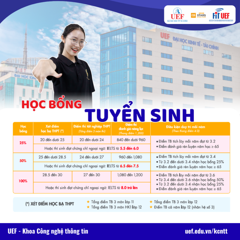 Với định hướng đào tạo gắn liền thực tiễn cùng nhiều chính sách học bổng hấp dẫn, UEF mang đến cho sinh viên một môi trường học tập năng động và nhiều cơ hội phát triển trong tương lai.