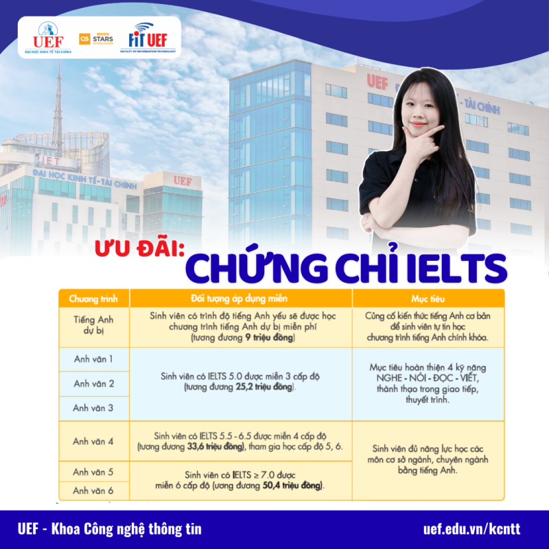 Bên cạnh chương trình chuyên môn, UEF còn chú trọng phát triển năng lực ngoại ngữ cho sinh viên thông qua các chính sách hỗ trợ tiếng Anh và chứng chỉ IELTS.