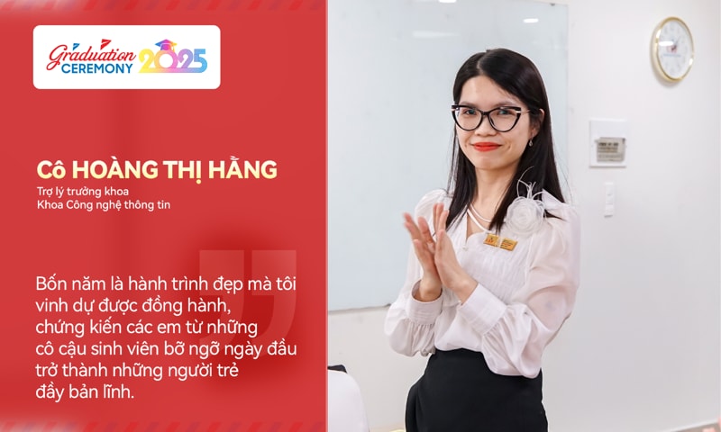 Cô Hoàng Thị Hằng cũng tràn đầy hy vọng rằng các bạn sẽ luôn bước đi, mạnh mẽ và tự tin. "Chắc chắn sẽ có đôi lúc vấp ngã nhưng mong các em đừng quên những gì đã được học. Đó không chỉ là kiến thức mà còn là niềm tin, là sự kiên cường. Chúc cho các bạn sinh viên của chúng ta sẽ như những bông hoa, tỏa hương rực rỡ, để bất cứ nơi đâu các bạn đến cũng sẽ luôn toả sáng sắc màu của tuổi trẻ, của ước mơ và nghị lực. Và đừng quên rằng Khoa Công nghệ thông tin, Nhà UEF luôn ở đây, luôn chào đón và chờ mong các bạn về thăm nhà".