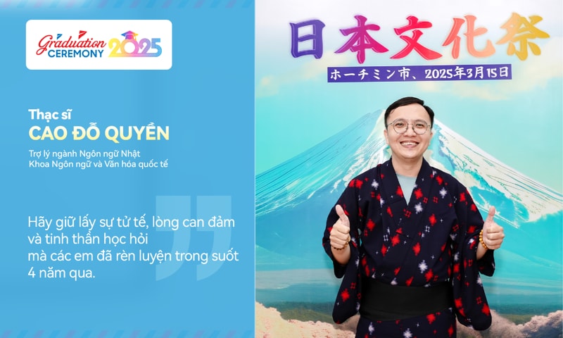 Còn với ThS. Cao Đỗ Quyền – Trợ lý ngành Ngôn ngữ Nhật thì kỷ niệm xúc động nhất là ở những buổi học cuối cùng. Khi thầy chưa kịp nói lời chia tay, sinh viên đã lặng lẽ chuẩn bị một món quà bất ngờ: “Những dòng tâm sự chân thành, sự biết ơn và cả lời hứa sẽ sống thật tốt đã khiến tôi không kìm được nước mắt. Có em nói rằng nhờ lớp học mà em tìm lại được động lực sống tích cực hơn. Cũng có những lần đi tham quan kiến tập, khi cả thầy và trò cùng ngồi hàn huyên tâm sự chia sẻ về ước mơ. Đó những khoảnh khắc đó rất thật, rất đẹp. Chính những điều giản dị như thế đã tiếp thêm cho tôi tình yêu với nghề giáo và niềm tin vào ý nghĩa của việc trồng người".