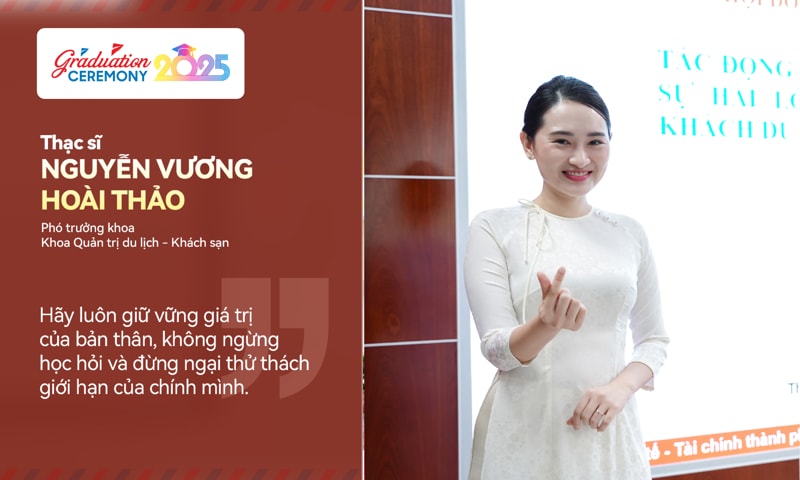 ThS. Nguyễn Vương Hoài Thảo mong rằng UEFers sẽ luôn giữ vững giá trị của bản thân, không ngừng học hỏi và đừng ngại thử thách giới hạn của chính mình. Cô nhắn nhủ: "Cô chúc các em luôn mạnh mẽ, kiên định và hạnh phúc trên con đường đã chọn. Dù đi đến đâu, mong các em luôn tự hào rằng mình là một sinh viên bản lĩnh bước ra từ Nhà UEF".