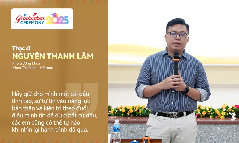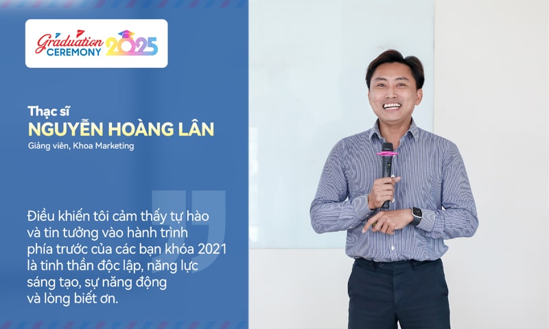 Chia sẻ cảm xúc trước thời khắc đặc biệt, ThS. Nguyễn Thanh Lâm - Phó Trưởng khoa, Khoa Tài chính - Kế toán đã bộc bạch rằng: “Tôi vui vì các em sắp bước sang một chặng đường mới nhưng cũng không tránh khỏi chút buồn khi biết rằng những buổi lên lớp, những tin nhắn hỏi bài hay những cuộc trò chuyện vội vàng ở hành lang cùng với các bạn sinh viên khóa 2021 sẽ dần ít lại. Điều khiến tôi tin tưởng vào thế hệ này chính là việc các em luôn biết hỗ trợ, sẻ chia và cùng nhau tiến bộ. Tôi tin rằng với tinh thần ấy, dù bước ra môi trường nào, các em cũng sẽ làm nên dấu ấn riêng của mình”.