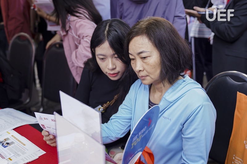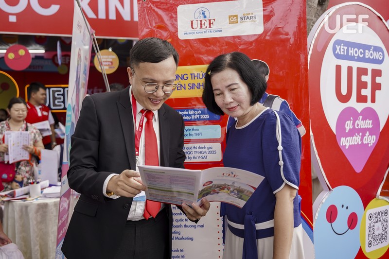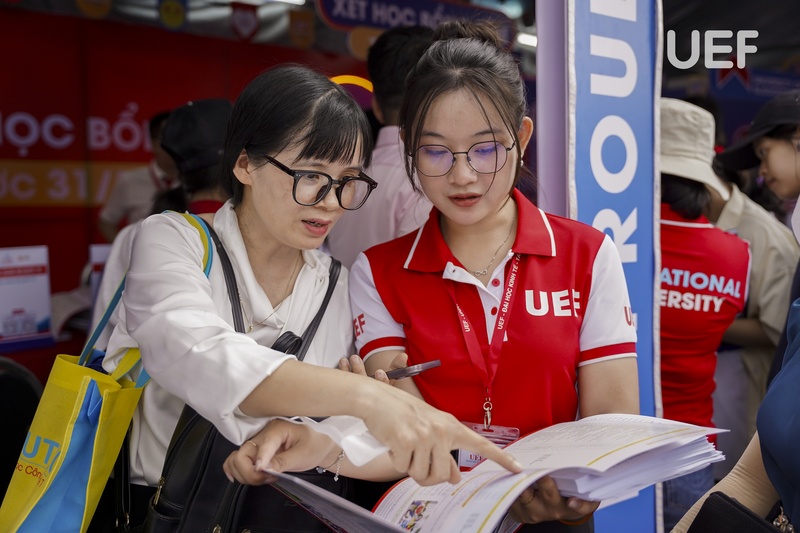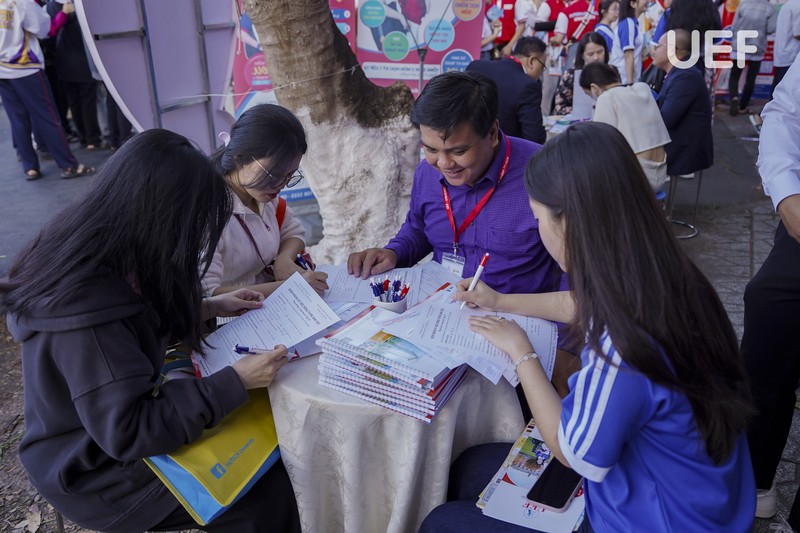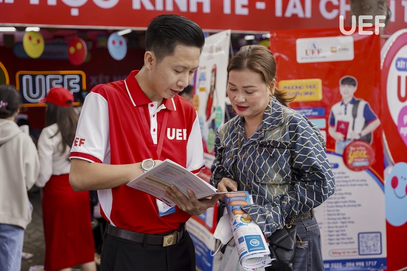 Tại khu vực của Nhà UEF, phụ huynh và thí sinh cũng được ban tư vấn cung cấp những thông tin mới nhất của kỳ tuyển sinh năm 2025, các phương thức tuyển sinh của UEF, chương trình đào tạo, chính sách học bổng - học phí, môi trường học tập song ngữ quốc tế, cơ hội việc làm sau tốt nghiệp,...