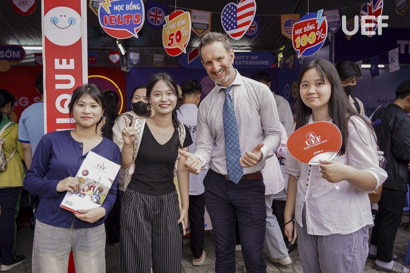 Bên cạnh đó, gian tư vấn dành cho chương trình liên kết quốc tế của UEF nhận sự quan tâm của thí sinh 2k7, đặc biệt là các bạn có thế mạnh tiếng Anh. Chương trình liên kết cùng trường đại học uy tín ở Anh, Mỹ giúp sinh viên trải nghiệm môi trường chuẩn quốc tế ngay tại Việt Nam, vừa tiết kiệm chi phí vừa thuận tiện cho việc học tập, đặc biệt là bằng cấp giá trị toàn cầu. Đó cũng là điểm thu hút đối với thí sinh, phụ huynh tìm hiểu chương trình này tại UEF.