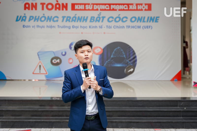 Xuyên suốt chương trình, báo cáo viên Nhà UEF đã mang đến nhiều nội dung thiết thực, gắn liền với thực tế cuộc sống số của giới trẻ hiện nay. Các bạn học sinh được giới thiệu những tình huống điển hình về rủi ro trên mạng xã hội, từ việc tiết lộ thông tin cá nhân, kết bạn với người lạ đến các chiêu thức giả mạo tinh vi nhằm dụ dỗ, lôi kéo nạn nhân. ThS. Nguyễn Minh Thắng cũng nhấn mạnh tầm quan trọng của việc bảo mật tài khoản, giới hạn chia sẻ thông tin và kiểm chứng nguồn tin trước khi tương tác hoặc cung cấp dữ liệu cá nhân.