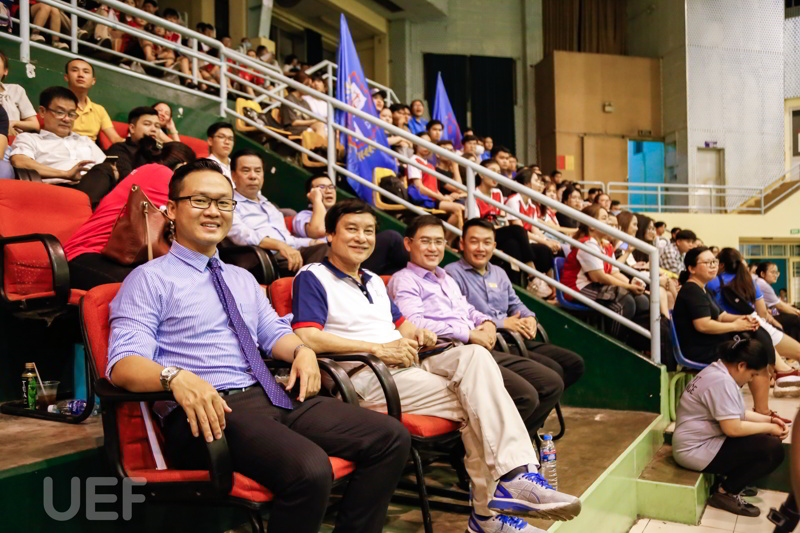 Đến tham dự, động viên tinh thần cho các vận động viên tại Nhà thi đấu Rạch Miễu có thầy Đỗ Quốc Anh - Phó Chủ tịch Hội đồng trường, TS. Nhan Cẩm Trí - Phó Hiệu trưởng Nhà trường, TS. Đỗ Hữu Nguyên Lộc - Phó Hiệu trưởng, Viện trưởng Viện quốc tế cùng các lãnh đạo, cán bộ, giảng viên, nhân viên các khoa, phòng, ban, trung tâm và đông đảo sinh viên Nhà UEF.
