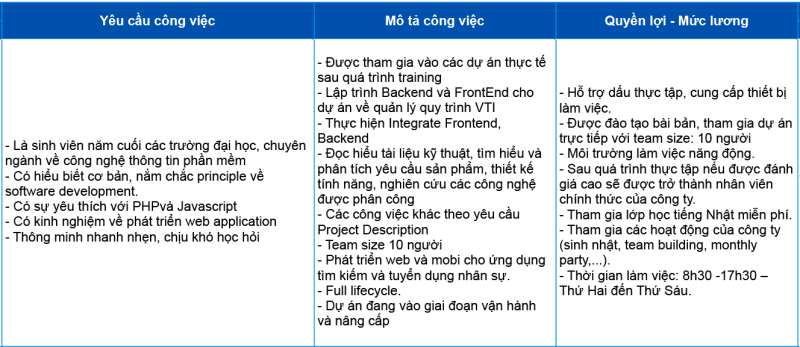 Về công ty VTI: VTI là công ty phần mềm chuyên cung cấp các dịch vụ cho các đối tác lớn của Nhật Bản, Hàn quốc, Việt Nam,… trong lĩnh vực chứng khoán, tài chính, bảo hiểm và sản xuất lớn như: Hitachi, Toyota, SamSung,LG, Vingroup…v.v, kết hợp với sự đa dạng về công nghệ mới như AI, ML, hay gần đây là Cloud Computing, Blockchain,… đã giúp những sản phẩm của VTI trong thực tiễn phù hợp với công nghệ số 4.0 và ứng dụng vào thực tiễn trong các nhà máy, khu công nghiệp, trường học để đáp ứng được nhu cầu của đối tác và người sử dụng. Minh chứng là VTI đang phát triển những sản phẩm do chính các kỹ sư và lập trình viên nhà VTI nghiên cứu để ứng dụng rộng rãi trong công việc và đời sống như: thiết bị nhận điện khuôn mặt, thiết bị check-in học sinh trên xe bus tại trường học...v.v.