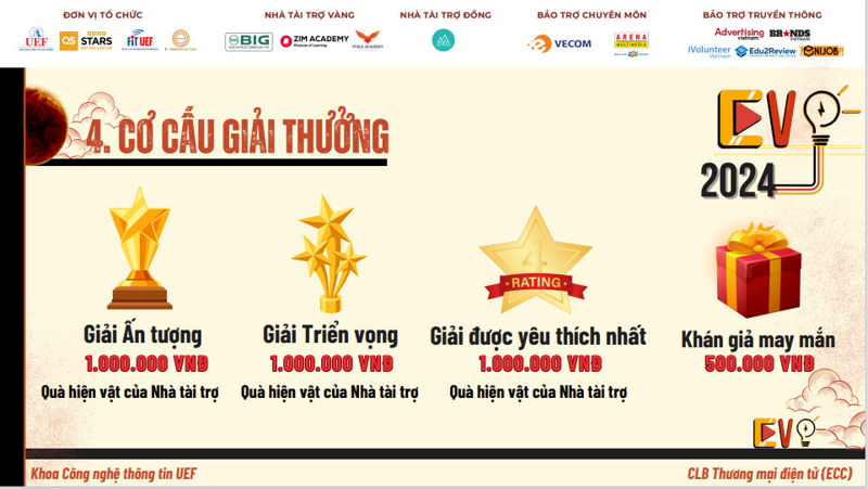 EVC 2024 được phối hợp tổ chức bởi Khoa Công nghệ thông tin và Câu lạc bộ Thương mại điện tử UEF - ECC, thu hút nhiều thí sinh đến từ các trường cao đẳng, đại học trên địa bàn TP.HCM đăng ký tham gia. Cuộc thi năm nay mang đến chủ đề “Different Ideas - One Target”, với ý nghĩa mỗi cá nhân mang trong mình rất nhiều ý tưởng để tạo nên sự đa dạng trong cách tiếp cận vấn đề. Tất cả cùng hướng đến mục tiêu chung là sự kiên định và sáng tạo, cùng nhau chinh phục những đỉnh cao của thành công.