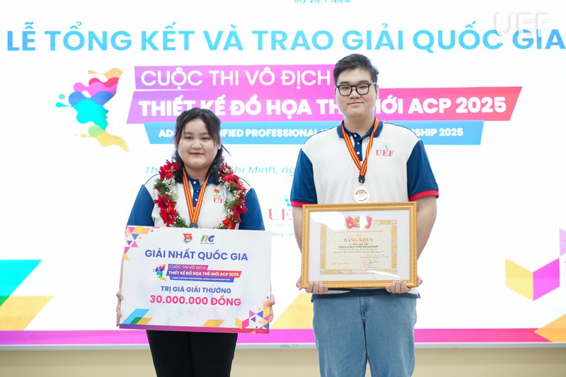 Đặc biệt, tại vòng Chung kết quốc gia cuộc thi năm nay, hai sinh viên của UEF đã xuất sắc ghi tên mình vào bảng vàng thành tích với những giải thưởng ấn tượng, thể hiện rõ năng lực chuyên môn, bản lĩnh sáng tạo và sự chuẩn bị nghiêm túc trong hành trình chinh phục đỉnh cao thiết kế đồ họa.