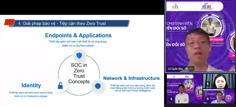 Đi kèm với chuyển đổi số là những nguy cơ về an toàn thông tin, là cơ hội và miếng mồi ngon của các hacker. Đây cũng là chủ đề được ông Lê Quốc Bảo chia sẻ ở phần 2 của chương trình là:"An ninh mạng trong chuyển đổi số". Theo đó, diễn giả đã phân tích cặn kẽ những vấn đề như: Tổng quan tình hình an toàn thông tin; Các hình thức tấn công phổ biến; Cơ hội và thách thức trong mảng an toàn thông tin, Kiến trúc giải pháp an toàn thông tin cho doanh nghiệp và nhu cầu nguồn lực an toàn thông tin.