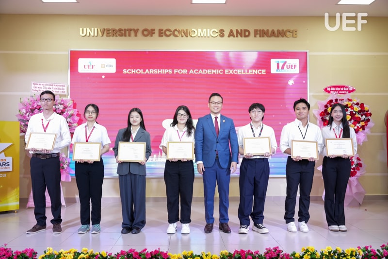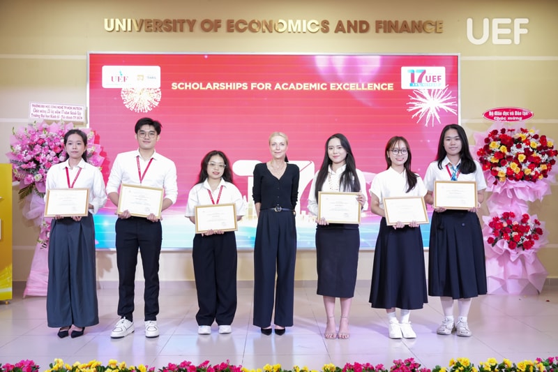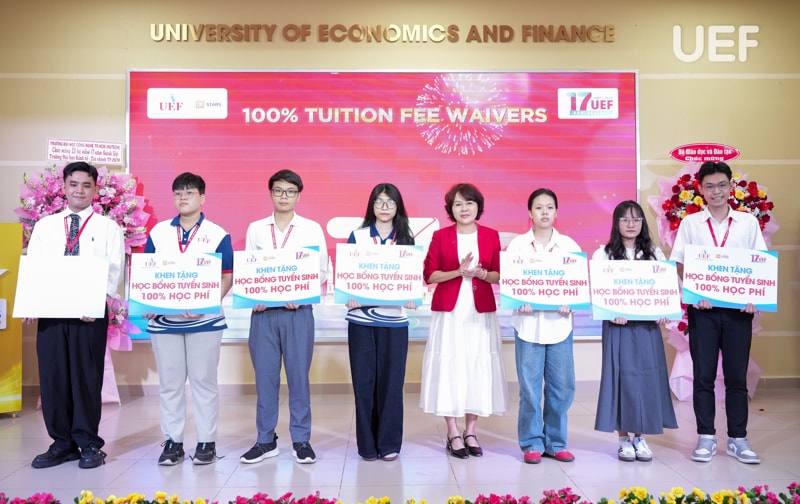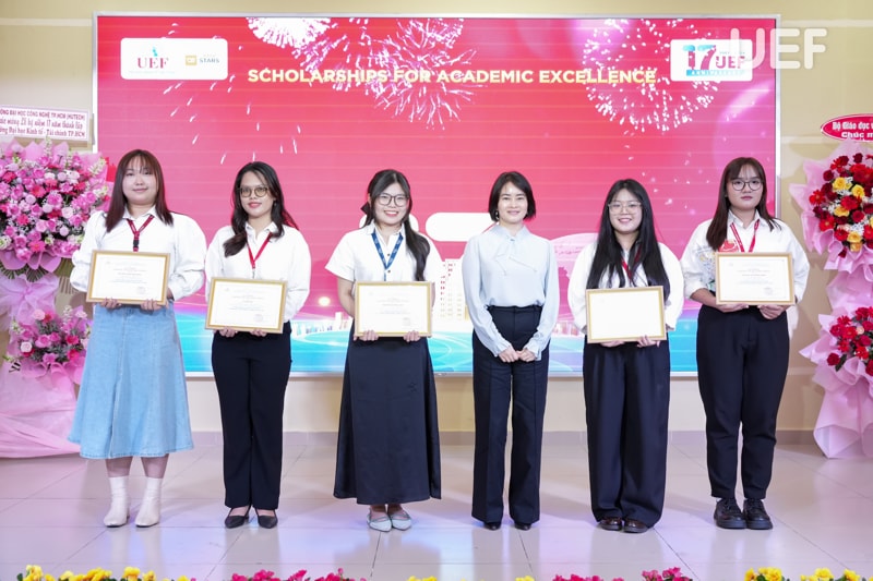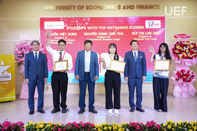 Nhằm tạo động lực để các bạn sinh viên tiếp tục phát huy tinh thần học tập tích cực, Nhà trường đã trao các suất học bổng tài năng cho sinh viên khóa 2021, 2022 và 2023 có thành tích học tập và rèn luyện xuất sắc trong năm học 2023 - 2024. Ngoài ra, UEF còn trao các suất học bổng tuyển sinh 100% cho tân sinh viên đạt điều kiện theo quy định và tuyên dương thành tích thủ khoa đầu vào theo các hình thức xét tuyển cho 3 tân sinh viên: Nguyễn Việt Hưng - ngành Quản trị nhà hàng và dịch vụ ăn uống (điểm học bạ 3 môn tổ hợp lớp 12), Nguyễn Đăng Sơn Trà - ngành Kinh doanh quốc tế (điểm học bạ 3 học kỳ) và Bùi Thị Lan Anh - ngành Luật Kinh tế (điểm thi THPT).