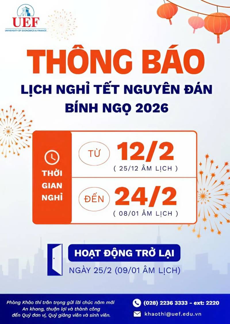 Căn cứ quy định về việc nghỉ các ngày lễ, Tết trong năm, Trường Đại học Kinh tế - Tài chính TP.HCM (UEF) thông báo lịch nghỉ Tết Nguyên Đán Bính Ngọ năm 2026 đến cán bộ - giảng viên - nhân viên (CB-GV-NV), học viên và sinh viên như sau: