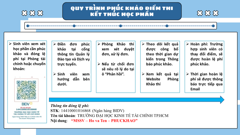 Bắt đầu từ năm học 2025-2026, Phòng Khảo thí triển khai đăng ký phúc khảo tại cổng Thông tin Quản lý Đào tạo và Dịch vụ trực tuyến. Quy trình phúc khảo như sau: