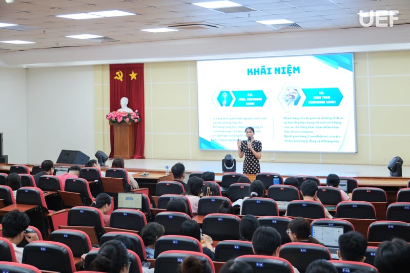 Chia sẻ về phương án giao nhận hàng container, diễn giả trước tiên đã phân biệt hai khái niệm FCL và LCL để sinh viên nắm rõ. Theo đó, FCL (Full Container Load) là hàng được giao nhận nguyên cont (cont đã niêm phong, kẹp chì); khi lượng hàng lớn, chiếm trọn trong một container hoặc lớn hơn 15cbm (gần đầy cont); một người gửi và một người nhận; chủ hàng là người đóng và dở hàng. LCL (Less than Container Load) là khách hàng sẽ cần gom và sử dụng dịch vụ tại kho để ghép chung với một số lô hàng của các chủ hàng khác nhau nhằm khai thác tối ưu container; người gom hàng (consolidator) có trách nhiệm gom hàng, đóng và dỡ hàng hóa.