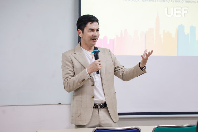 Ông Ngô Thái Thông đã ôn lại cho các bạn sinh viên về các loại hình bất động sản nhà ở và bất động sản thương mại trước khi đi sâu vào phân tích chủ đề chính. UEFers cũng được hiểu rõ hơn về các loại mô hình đô thị kiểu mẫu tại Việt Nam kèm với các tiêu chí đánh giá. Chẳng hạn như: Đô thị phức hợp (ở, làm việc, học tập và giải trí); Đô thị thông minh (ứng dụng công nghệ và trí tuệ nhân tạo vào quy hoạch, thiết kế, thi công, vận hành); Đô thị sinh thái (bảo vệ môi trường, giao thông bền vững, quản lý tài nguyên hiệu quả, công trình xây dựng, xã hội và cộng đồng, công nghệ).
