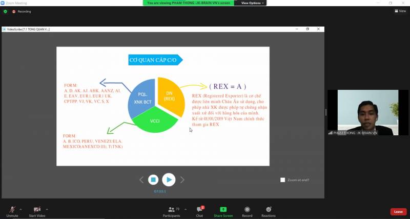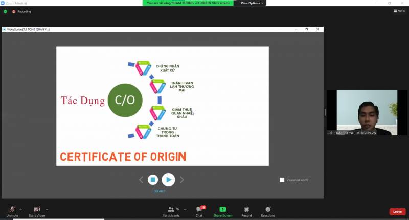 Phần đầu của buổi học, diễn giả đã bắt đầu nói về tổng quan của C/O. Có rất nhiều tác dụng của C/O nhưng thông thường thì C/O có 4 tác dụng chính đó là Chứng nhận xuất xứ; Tránh gian lận thương mại; Giảm thuế quan nhập khẩu và là một trong những chứng từ trong thanh toán. Diễn giả nhấn mạnh rằng nhiều bạn sinh viên vẫn thường hay hiểu nhầm về tác dụng giảm thuế của C/O cho việc xuất khẩu, nhưng thực chất là làm C/O để cho nước mà doanh nghiệp nhập khẩu sẽ được hưởng ưu đãi thuế. Thêm vào đó, nếu doanh nghiệp có chứng nhận nguồn gốc xuất xứ rõ ràng thì sẽ tạo được uy tín và tăng khả năng cạnh tranh cho doanh nghiệp của mình.