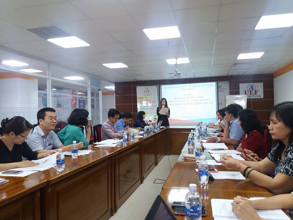 “VẬN DỤNG HIỆU QUẢ PHƯƠNG PHÁP GIẢNG DẠY TÍCH CỰC TRONG ĐÀO TẠO NGUỒN NHÂN LỰC LĨNH VỰC KINH TẾ” Chiều ngày 22/11/2017, Khoa Kinh tế đã tổ chức thành công hội thảo ““Vận dụng hiệu quả phương pháp giảng dạy tích cực trong đào tạo nguồn nhân lực lĩnh vực kinh tế” với sự tham gia của Ban Giám hiệu và đông đảo các thầy cô của khoa Kinh tế và các khoa bạn. Kiên trì theo đuổi mô hình đào tạo chất lượng cao, chuẩn quốc tế nhằm cung cấp nguồn nhân lực kinh tế, quản trị, tài chính, kế toán, công nghệ và ngôn ngữ cho khu vực phía Nam nói riêng, cả nước nói chung, khoa Kinh Tế trường đại học Kinh Tế - Tài chính TP.HCM (UEF) đã có nhiều hoạt động nhằm trao đổi việc áp dụng phương pháp dạy học hiện đại, tích cực vào công tác giảng dạy. Khoa Kinh Tế đã tổ chức hội thảo “Vận dụng hiệu quả phương pháp giảng dạy tích cực trong đào tạo nguồn nhân lực lĩnh vực kinh tế” nhằm tạo diễn đàn để các giảng viên thảo luận xoay quanh các vấn đề về phương pháp giảng dạy và vận dụng hiệu quả trong môi trường UEF.