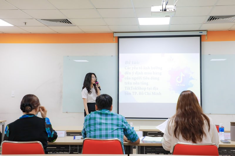 Hội đồng nghiệm thu đề tài nghiên cứu khoa học sinh viên 2 diễn ra vào chiều 12/4. Có 4 đề tài nghiên cứu khoa học được báo cáo, bao gồm: Sự bùng nổ của Short Video - Các nhân tố ảnh hưởng đến tần suất xem Short Video của người dùng; Các yếu tố ảnh hưởng đến quyết định đầu tư chứng khoán của thế hệ Gen Z ở TP.HCM; Các yếu tố ảnh hưởng đến ý định mua sắm của người tiêu dùng trên nền tảng TikTok Shop tại địa bàn TP.HCM; Yếu tố ảnh hưởng đến sự lựa chọn sử dụng thực phẩm chức năng của giới trẻ trên địa bàn TP.HCM.