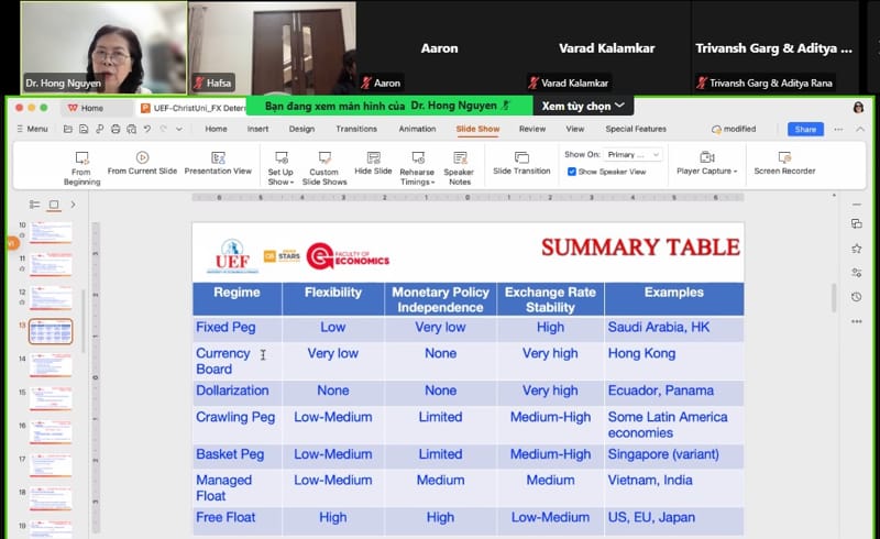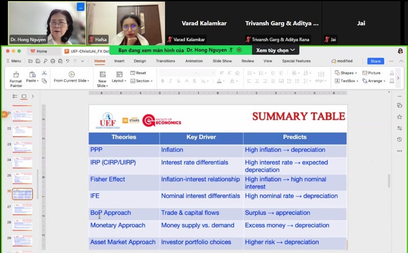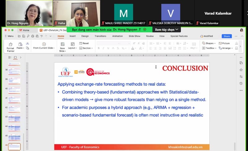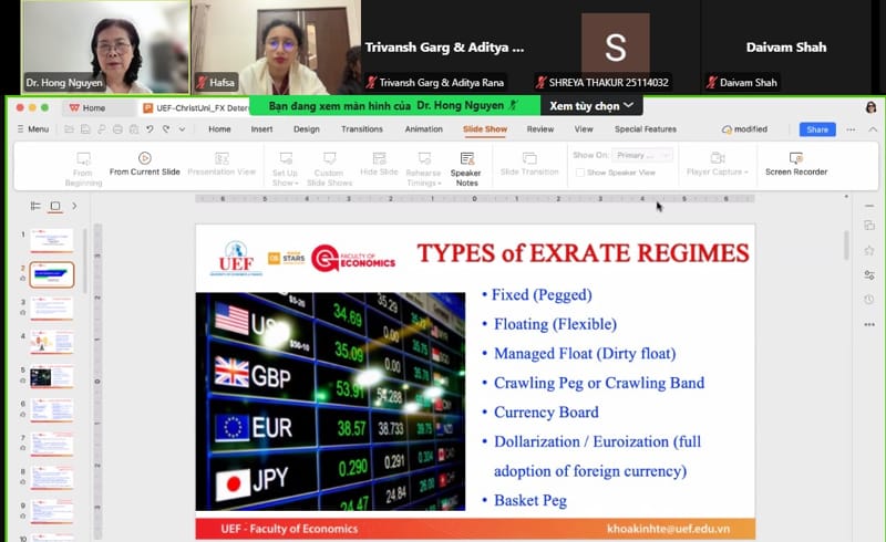Trong buổi học thứ ba của chuỗi khóa học trực tuyến Kinh tế - Tài chính, học viên cao học Christ University (Ấn Độ) và sinh viên UEF tiếp tục được dẫn dắt bởi TS. Nguyễn Thị Cúc Hồng - Giảng viên Khoa Kinh tế UEF với chủ đề FX Determination (Cơ chế xác định tỷ giá hối đoái). Buổi học mang đến góc nhìn toàn diện về cách thức vận động của thị trường ngoại hối, các mô hình lý thuyết giải thích biến động tỷ giá và ứng dụng thực tiễn trong phân tích kinh tế quốc tế.