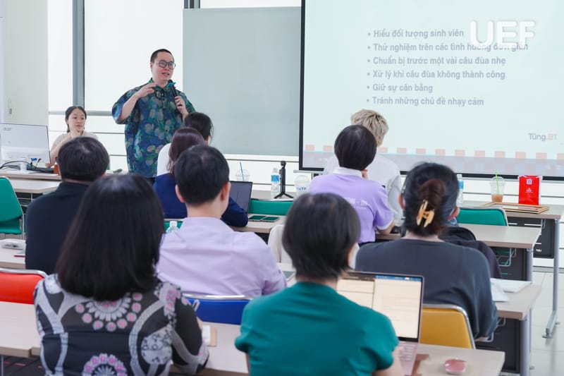 Trong hai buổi cuối của chuỗi tập huấn “Ứng dụng công nghệ và các phương pháp đổi mới sáng tạo trong giảng dạy” vào ngày 10/1, các thầy cô Nhà UEF đã được hướng dẫn phương pháp lồng ghép yếu tố hài hước vào giảng dạy và được chứng nhận hoàn thành chương trình.