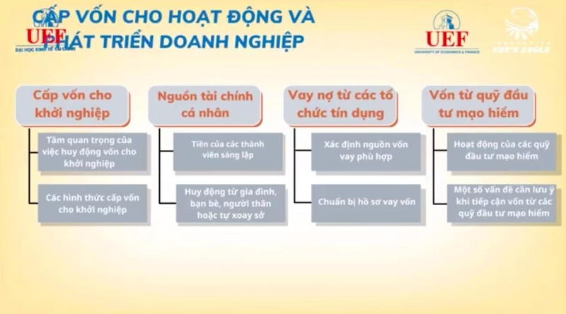 Về vấn đề cấp vốn cho hoạt động và phát triển doanh nghiệp, CEO Minh Yến đã giúp thí sinh nắm rõ thông qua sơ đồ huy động vốn. Theo đó, các hình thức cấp vốn cho khởi nghiệp bao gồm: nguồn tài chính cá nhân, vay nợ từ các tổ chức tín dụng, vốn từ quỹ đầu tư mạo hiểm.