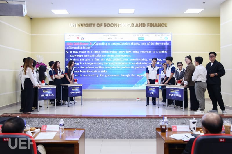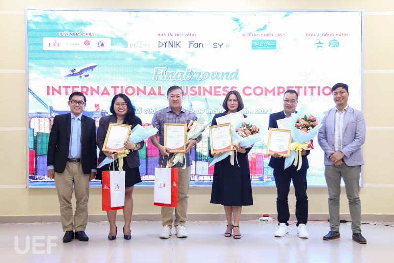 Thành phần Ban giám khảo là: ông Nguyễn Quan Phúc - Nguyên Trưởng Phòng Quản lý xuất nhập khẩu, khu vực Hồ Chí Minh, Bộ Công Thương, ông Nguyễn Duy Bá - Vietnam CHB Business Development Manager, Công ty TNHH Maersk Việt Nam, bà Lê Thị Ngọc Thủy - Chủ tịch HĐQT Công ty Viva STAR Coffee Corporation, GS.TS. Hoàng Thị Chỉnh - Giảng viên ngành Kinh doanh quốc tế UEF, TS. Lâm Thanh Phi Quỳnh - Giảng viên ngành Kinh doanh quốc tế UEF.