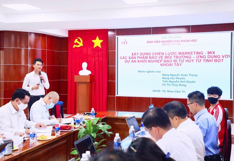 Một trong 03 đề tài tiến vào vòng Chung kết năm nay đến từ nhóm nghiên cứu gồm các sinh viên Đặng Nguyễn Xuân Trọng, Nông Văn Phước, Nguyễn Trần Ánh Duyên và Nguyễn Thị Thùy Dung được sự hướng dẫn bởi TS. Nhan Cẩm Trí - Phó hiệu trưởng, Trưởng khoa Kinh tế. Được biết, đề tài "Xây dựng chiến lược Marketing - Mix cho các sản phẩm Bảo vệ môi trường - Ứng dụng với dự án khởi nghiệp bao bì tự hủy từ tinh bột khoai tây" đã được các bạn ấp ủ từ lâu và cũng đã vinh dự đạt giải nhì tại Giải thưởng sinh viên nghiên cứu khoa học cấp trường năm 2020 vừa qua.