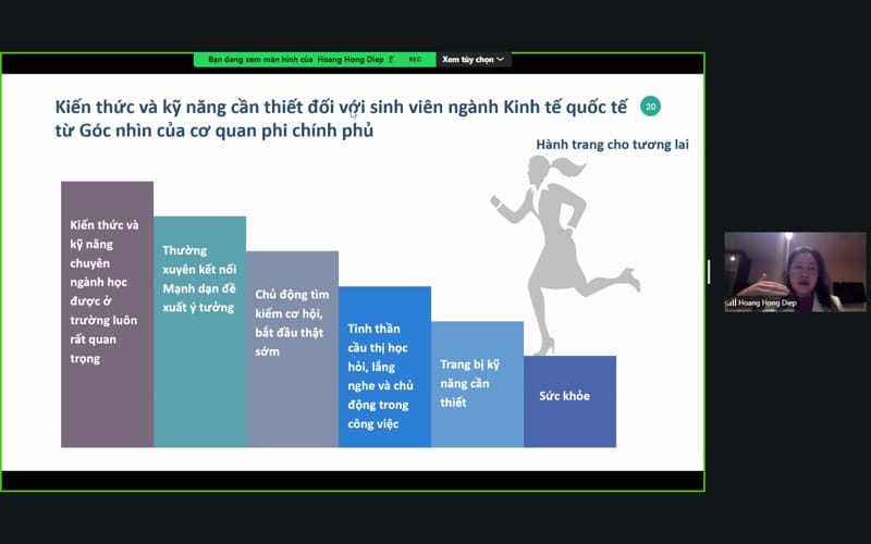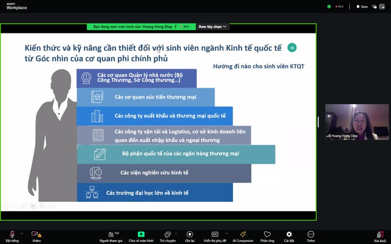 Chia sẻ về lĩnh vực kinh tế quốc tế, bà Hồng Diệp đã cung cấp thông tin về tình hình hội nhập kinh tế quốc tế của Việt Nam, đồng thời chỉ ra các kiến thức và kỹ năng cần thiết đối với sinh viên ngành Kinh tế quốc tế từ góc nhìn của cơ quan phi chính phủ.