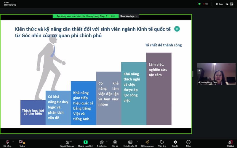 Từ thực tiễn của nền kinh tế và góc nhìn của cơ quan phi chính phủ, bà Hồng Diệp chia sẻ các kiến thức và kỹ năng cần thiết đối với sinh viên ngành Kinh tế quốc tế. Theo đó, các bạn cần có khả năng tư duy logic và phân tích vấn đề, khả năng giao tiếp hiệu quả bằng tiếng Việt và tiếng Anh, khả năng làm việc độc lập và làm việc nhóm, khả năng thích nghi và chịu đựng áp lực cao,…