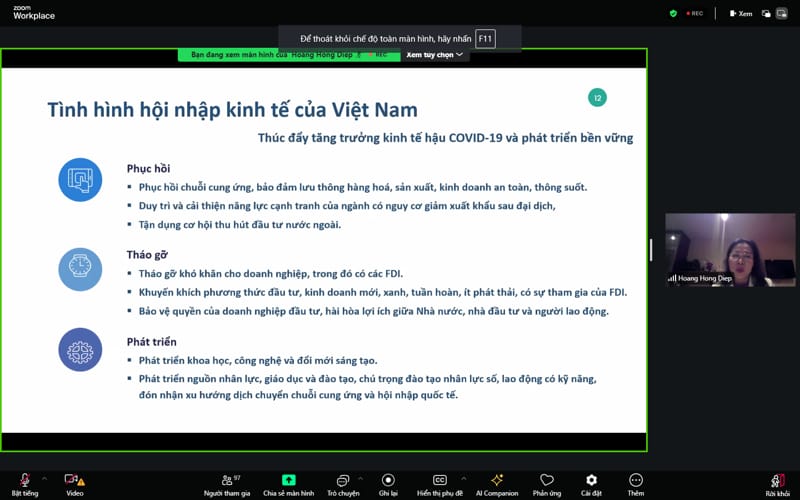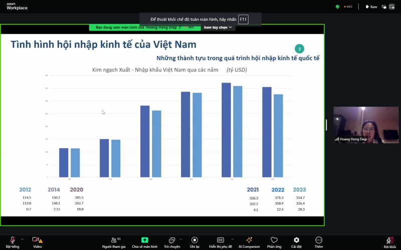 Về tình hình hội nhập kinh tế quốc tế của Việt Nam, diễn giả đã phân tích tổng quan về kim ngạch xuất - nhập khẩu trong 3 năm gần nhất, các cam kết kinh tế quốc tế, các hiệp định thương mại tự do, sự thúc đẩy tăng trưởng kinh tế và phát triển bền vững,…