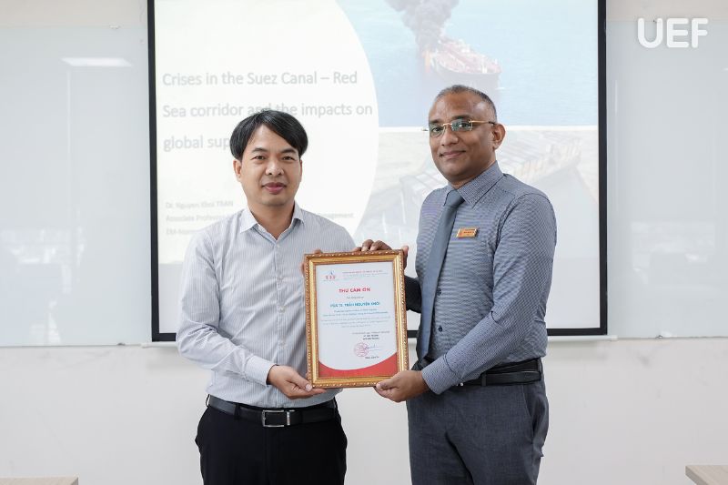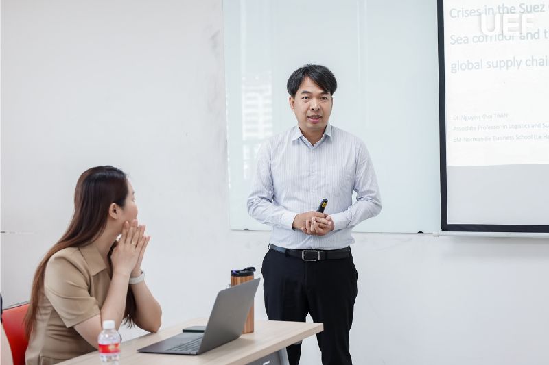 Nhằm cập nhật kiến thức thực tiễn, mở rộng góc nhìn toàn cầu cho thầy cô giảng viên, sáng ngày 10/7, Khoa Kinh tế (FOE) đã tổ chức buổi chia sẻ chuyên môn với chủ đề “Crises in the Suez - Red Sea Corridor and Impacts on Global Supply Chains”, dưới sự dẫn dắt của PGS.TS. Trần Nguyên Khôi - Chuyên gia Logistics và Quản trị Chuỗi cung ứng, Giám đốc Học thuật - Dự án Việt Nam, Trường Kinh doanh EM Normandie.
