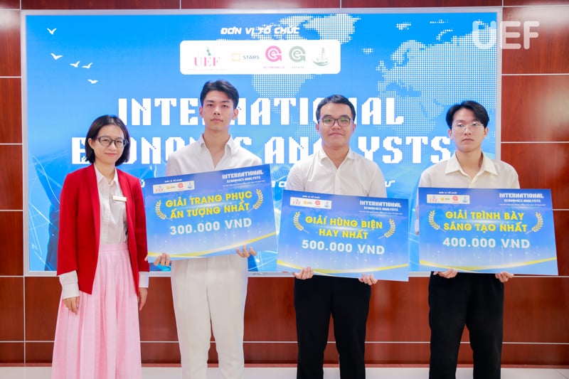 Bên cạnh đó, các giải phụ cũng được trao cho những thí sinh có dấu ấn cá nhân nổi bật: bạn Bùi Đặng Nam Khánh nhận Giải Hùng biện ấn tượng nhất, bạn Dương Lê Thành nhận Giải Thuyết trình ấn tượng, bạn Nguyễn Quang Nhật Nam được trao cả Giải Trang phục ấn tượng và danh hiệu Thí sinh triển vọng do Ban giám khảo bình chọn. Những kết quả này không chỉ là sự ghi nhận cho quá trình nỗ lực của các bạn mà còn là minh chứng cho tinh thần học thuật chủ động, sáng tạo của sinh viên UEF trong lĩnh vực kinh tế quốc tế.