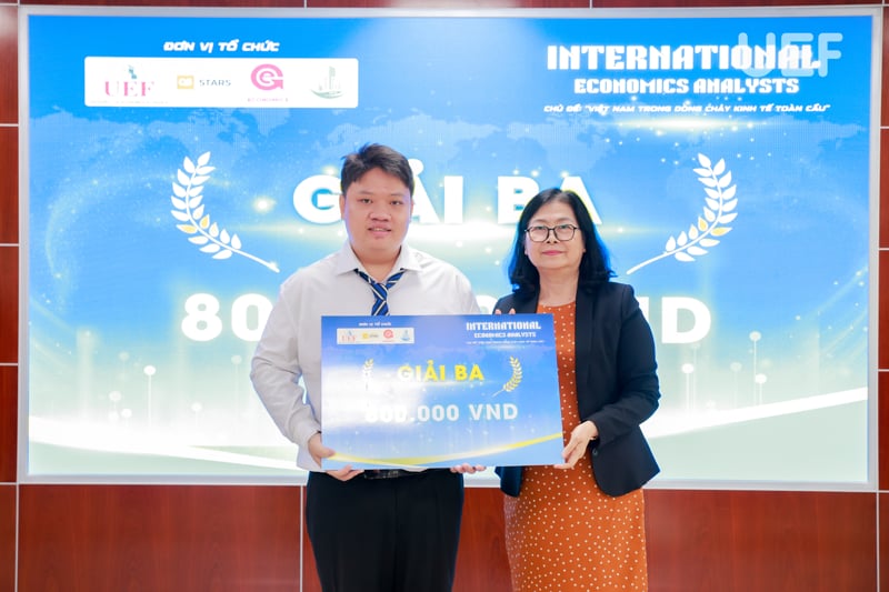 Khép lại cuộc thi International Economics Analysts, Ban tổ chức đã vinh danh những gương mặt xuất sắc nhất mùa giải năm nay. Giải thưởng cao nhất – Trạng nguyên Kinh tế thuộc về bạn Nguyễn Viết Thanh với phần thể hiện toàn diện, lập luận chặt chẽ và tư duy sắc bén. Bạn Hồ Nguyễn Nhật My và bạn Nguyễn Đức Anh Tài lần lượt nhận giải Nhì và giải Ba nhờ phần trình bày rõ ràng, logic và bám sát thực tiễn.