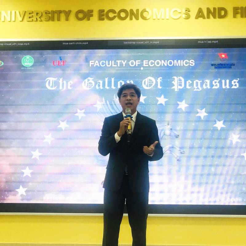 Mở đầu chương trình, TS.Nguyễn Thanh Giang - Hiệu trưởng Nhà trường đã gửi lời chúc mừng đến toàn thể các bạn tân sinh viên khoa Kinh tế khóa 2020 đã gia nhập vào "ngôi nhà chung" mang tên UEF. Ngoài ra, thầy còn nhấn mạnh rằng, các bạn chính là những "chú ngựa chiến lớn" của Nhà trường, có thể "phi nước đại" bằng cách đi xa và đi thật nhanh. Thời gian qua, các bạn cũng đã vượt qua giai đoạn khó khăn thì chắc chắn rằng cũng sẽ chiến thắng các trận sau một cách mạnh mẽ, nhanh chóng và tự tin. Riêng với khối ngành Kinh tế, thầy cũng gửi gắm đến các bạn 3 điều cần trang bị: mạng lưới quan hệ tốt, tư duy nhạy bén và sự khác biệt đến từ tinh thần khởi nghiệp.