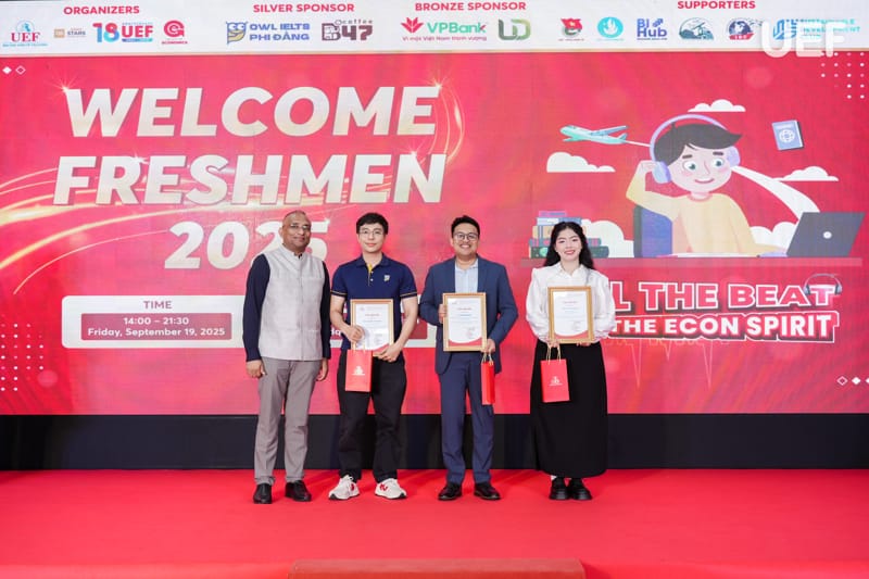 Trong chương trình, Khoa Kinh tế cũng đã khen thưởng 6 sinh viên nhận học bổng tài năng và vinh danh 11 tân sinh viên đạt học bổng tuyển sinh đầu vào. Đây là sự ghi nhận nỗ lực học tập của các bạn ngay từ ngày đầu trở thành sinh viên UEF.